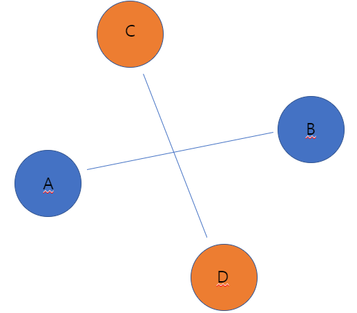 이럴 때 두 선분이 교차하는지 확인하는 방법은 정점의 상대적인 위치를 확인해주는 것입니다.