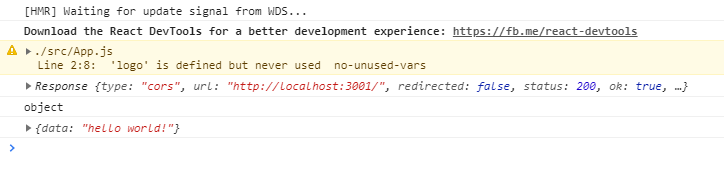 3001번 포트에서 가져온 데이터인 res, 타입, json을 통해 콘솔한 결과가 아래와 같이 나타난다.