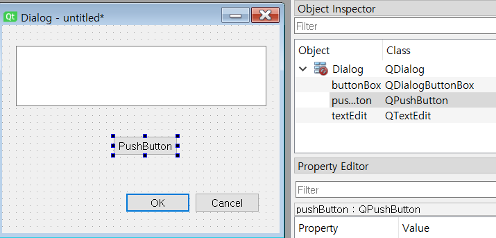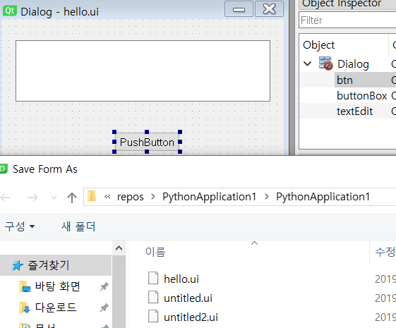 pushButton 이나 textEdit 은 하나의 객체를 뜻하고 나중에 python 으로 pyqt 코드를 만질 때 건드릴 수 있다.