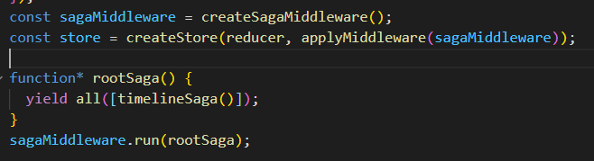 제너레이터로 선언한 rootSaga 의 timelineSaga는 위에서 언급한 saga 코드를 가져온 것이며,